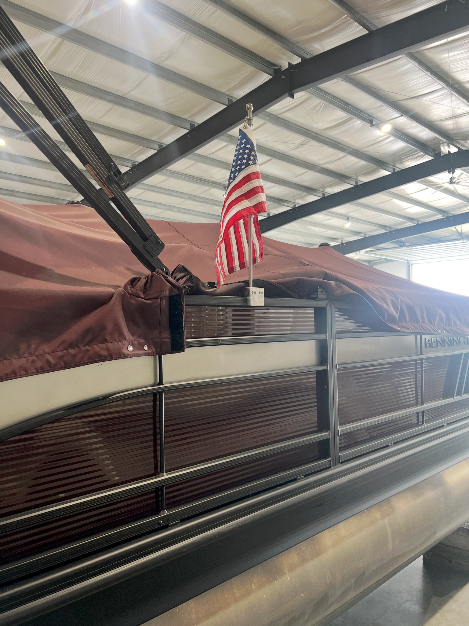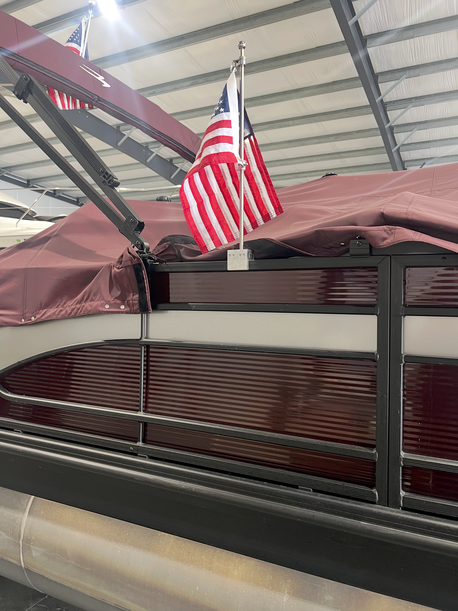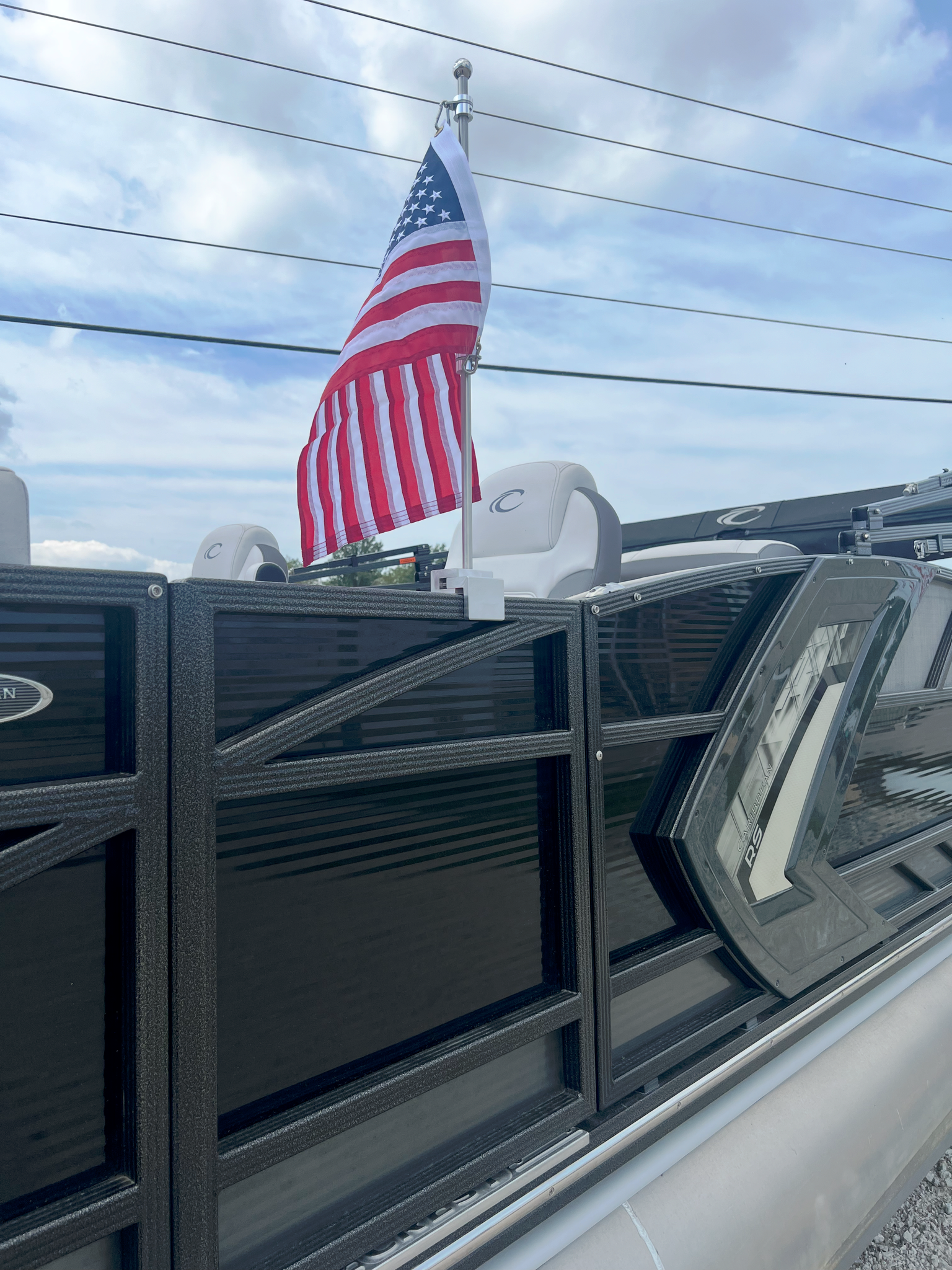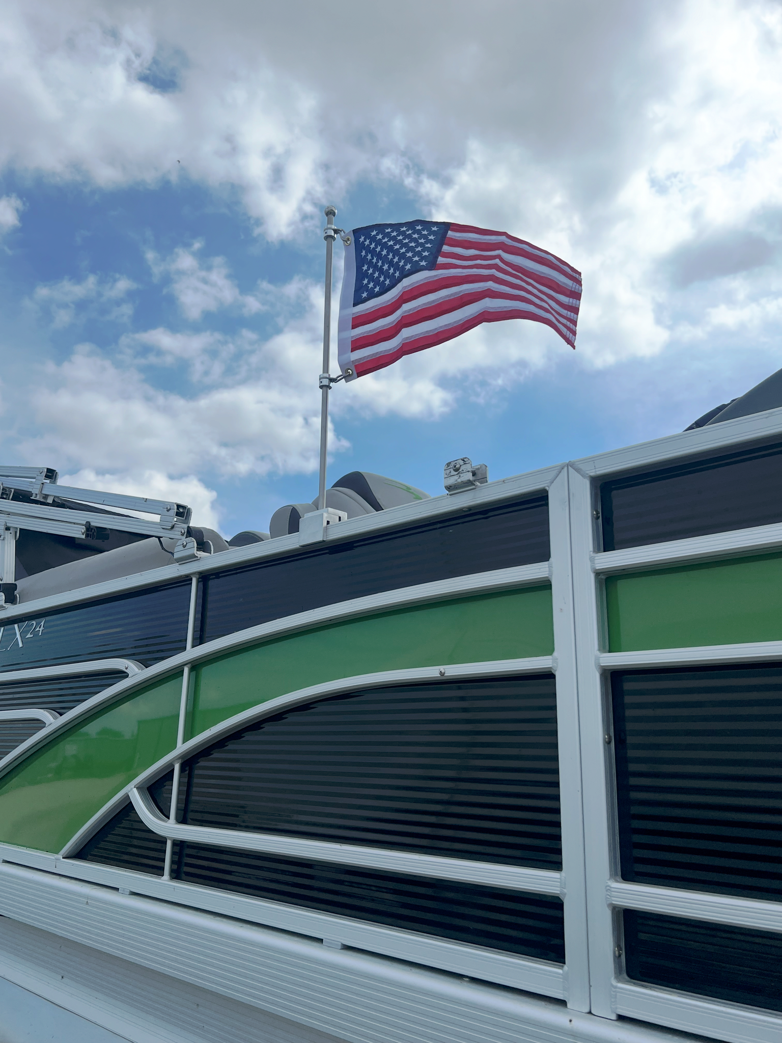 Wavy Flag solid pontoon square rail mount aluminum base with a stainless pole designed for 1.0" to 1.75" rails.  Our burgee pole uses a unique heavy duty slide connector design that is easy to install but will withstand the harshest conditions and highest of winds.  Wavy Flag builds the highest quality and most sturdy rail mount poles on the market.  We have designed an aluminum anti furling flag mounting coupling that will allow the flag to rotate 360 degrees to compensate for changing wind conditions and the constant direction changes common to boaters.  The top of the pole is plain without any topper.  This product is shipped complete and ready to install with the integral clamshell design, swivel bearings, tools and carabiner clips.